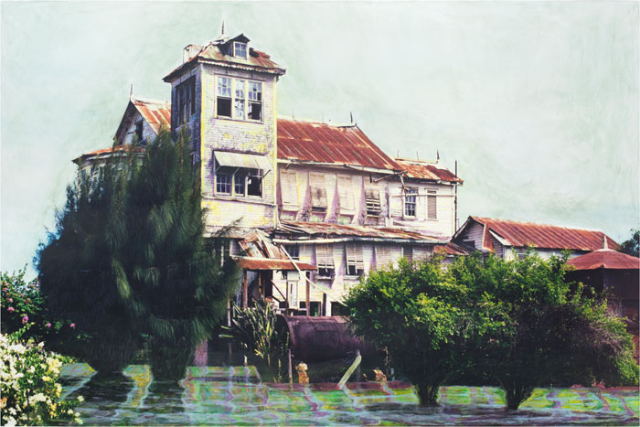 These houses are falling apart, and returning back to the earth from which they originally came as trees. They are like spirit houses. The titles are all real place names, either streets in Georgetown or villages from the coastal road of Guyana. Many of these village names are actually the names of the old plantations, but many are the names given to their new communities by freed African slaves, or by indentured labourers from India. These village names are evocative of hope, but also of the different colonial powers that passed through the land. The rising water references the real threat of flood in this country which, like Holland, is below sea level. But it is also the Flood of the Mind, or Memory, washing away the past. When I was small the wood for building and maintenance was cheap. Now concrete is cheaper, and these houses are disappearing. The wood is expensive partly because it is being logged by Chinese companies and shipped out. Houses are increasingly left empty to rot when people emigrate, or the owners die and there are disputes over a legacy, especially when the children now live abroad.