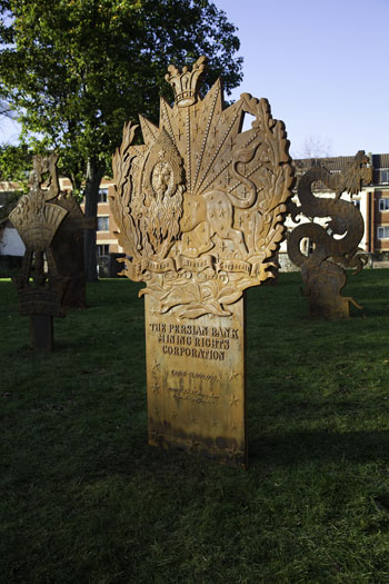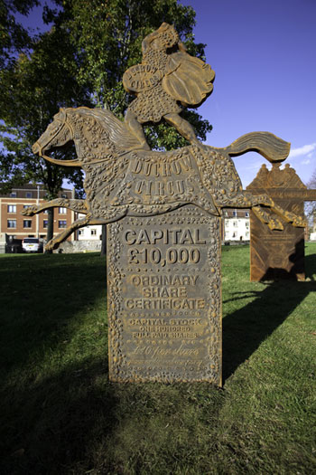 “Locke has produced ten cast iron gravemarkers commemorating commercial companies that have ceased trading or undergone radical transformation. The outline forms, visual imagery and texts on each marker are drawn from historical documents such as share certificates.